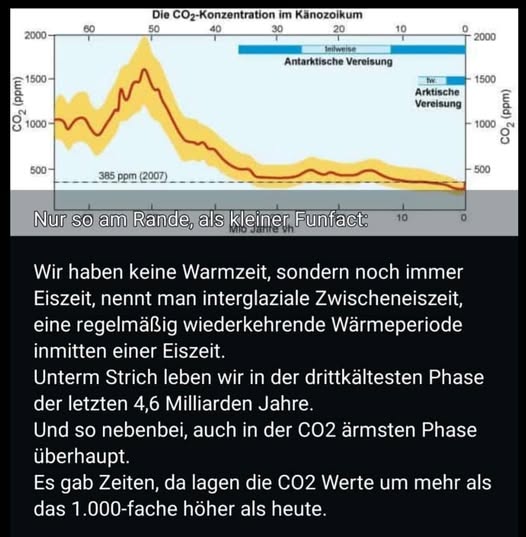 Für mich verblüffend sind die Angaben des Co2 Gehaltes in der Luft vor Millionen von Jahren bis in die Neuzeit. Ich frage mich, welche Messtechniken angewandt wurden oder ob auch hier geologische Erkenntnisse hochgerechnet wurden. Nur weil etwas so explizit Behauptet wird muss es noch lange nicht stimmen. Vor allem werden hier erneut andere, nicht bekannte Komponenten, völlig außeracht gelassen.